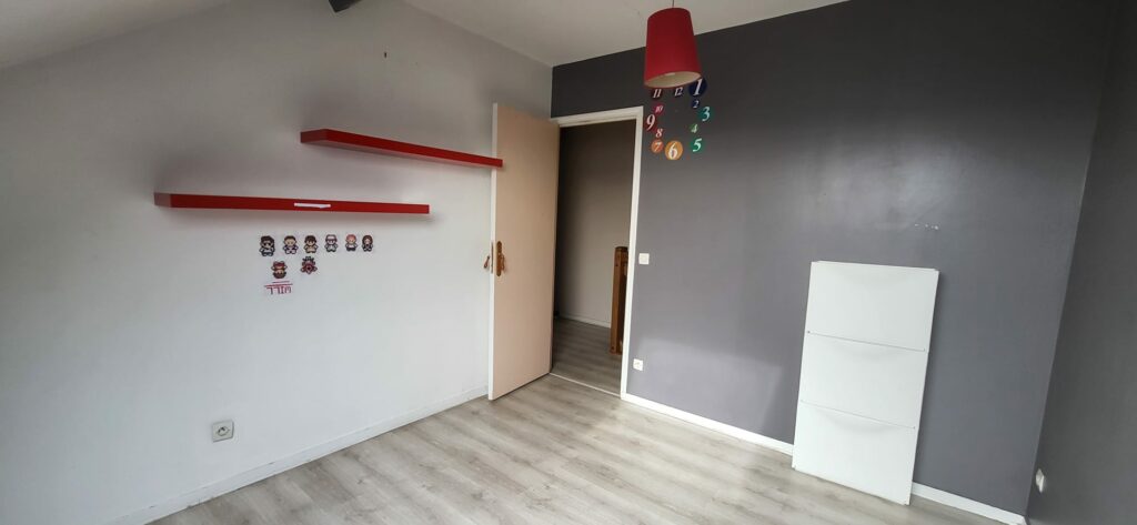 A l’étage, l’espace nuit se compose d’une salle de bain avec un velux et de deux chambres mansardées avec velux et placard.